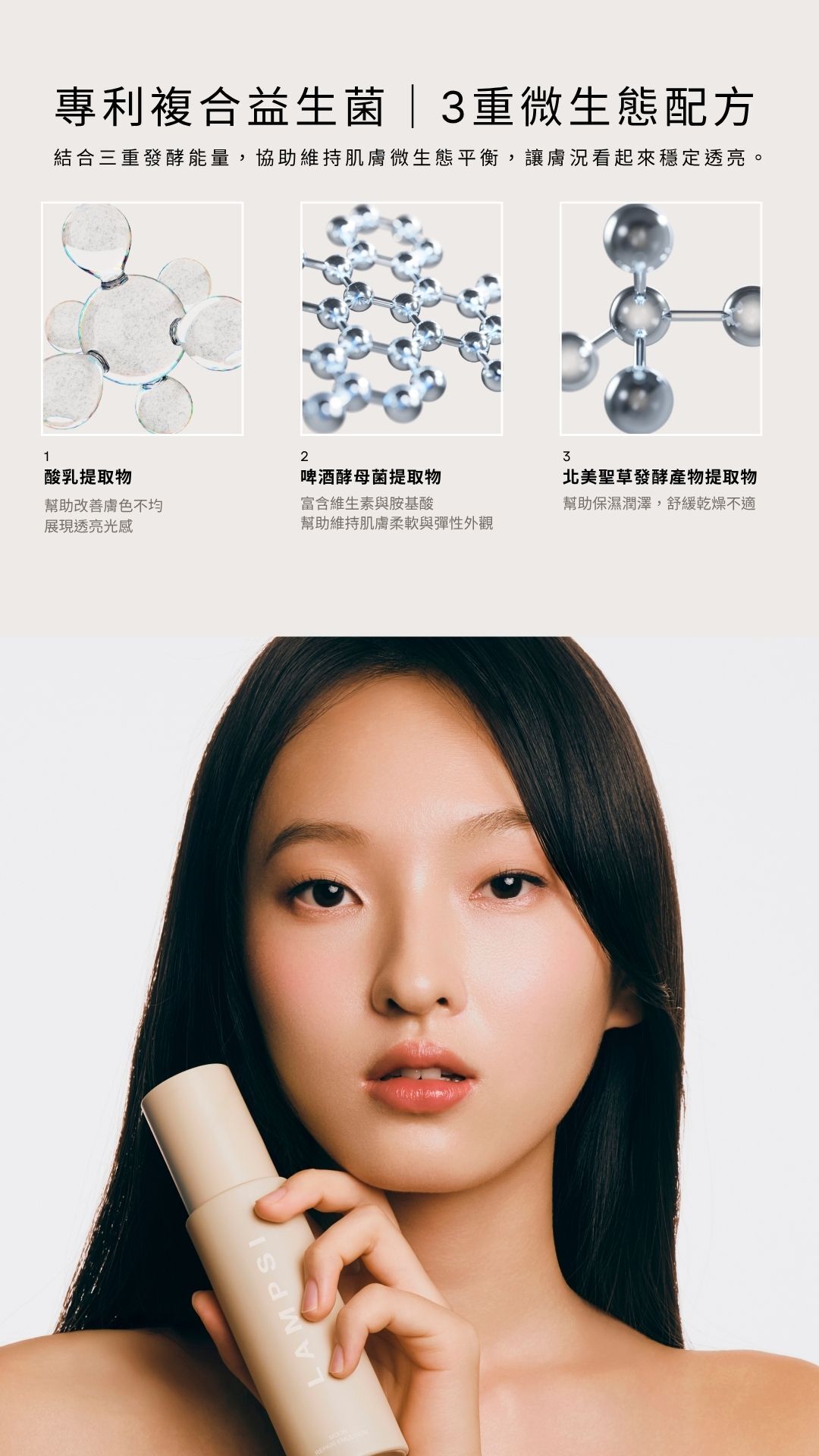 選用多種益生菌發酵成分(如乳酸桿菌/北美聖草發酵物、半乳糖酵母發酵物),為肌膚打造良好保養基礎。